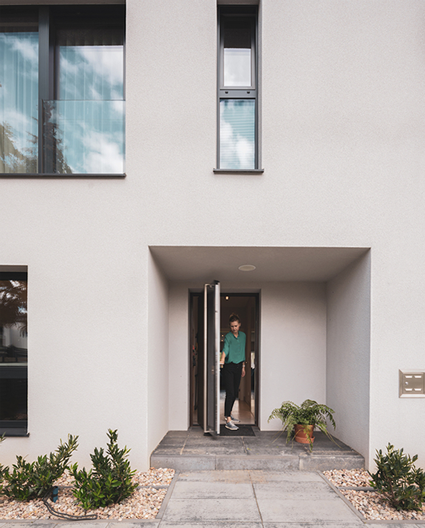 The building plot is surrounded by built-up homes and undeveloped plots. Rectangular in shape, the shortest border runs adjacent to the road, with the building set 5 m from the easement. The building stands as close as possible to the north and west border to allow for a spacious garden. The extended corner of the plot serves as an entrance to the garage that also allows for additional parking, thereby saving precious space.
